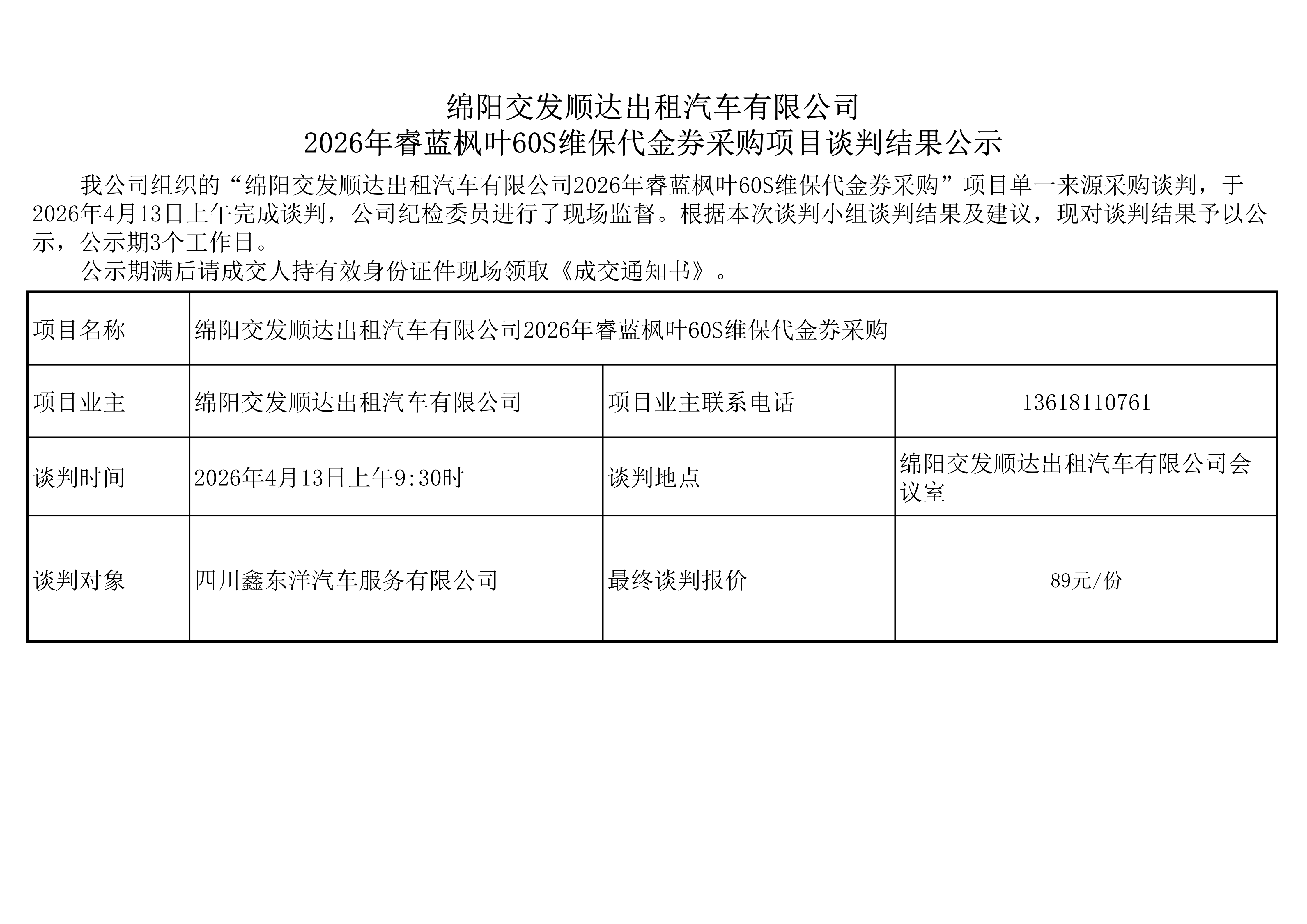 绵阳交发顺达出租汽车有限公司 2026年睿蓝枫叶60S维保代金券采购项目谈判结果公示